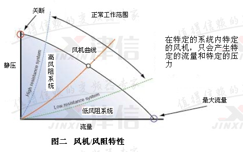 選擇風(fēng)機(jī)的基本原則:在特定的系統(tǒng)里特定的風(fēng)機(jī),只會(huì)產(chǎn)生特定的流量和特定的壓力。風(fēng)機(jī)輸出壓力特性曲線和系統(tǒng)風(fēng)阻特性曲線的交點(diǎn)就是風(fēng)機(jī)的工作點(diǎn)。
