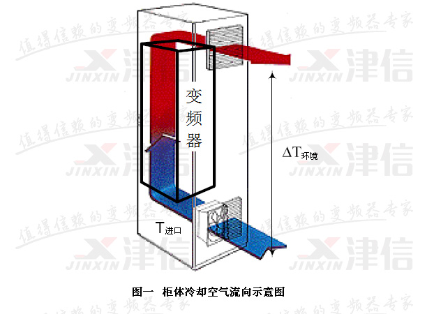 變頻器一般通過變頻器內(nèi)置的風(fēng)扇來散熱,如果變頻器安排在柜體內(nèi),這會(huì)導(dǎo)致柜體溫度升高。雖然柜體的柜壁也有一定的散熱能力,但是由于柜體的柜壁散熱能力小于50W,在計(jì)算中,這部分散熱可以忽略不計(jì),所以還需要采取其他外部措施來散熱。最典型的散熱方式是在柜門或柜壁上安裝風(fēng)扇,如圖一所示。
