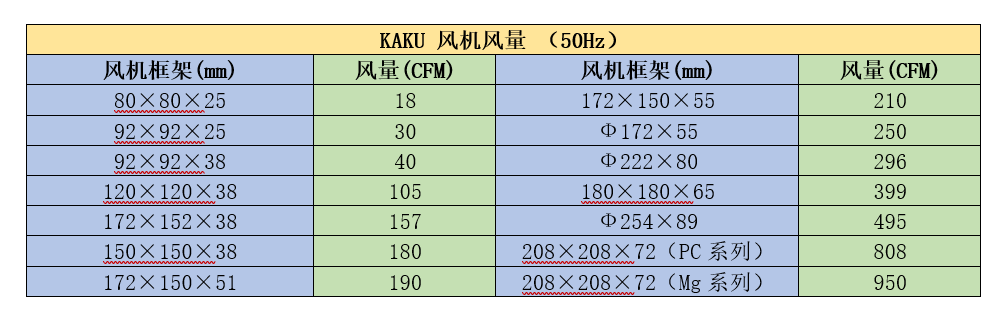 下表列出市場(chǎng)上比較常見的卡固(KAKU)風(fēng)機(jī)的數(shù)據(jù),作為我們上面例子的風(fēng)機(jī)選型參考。