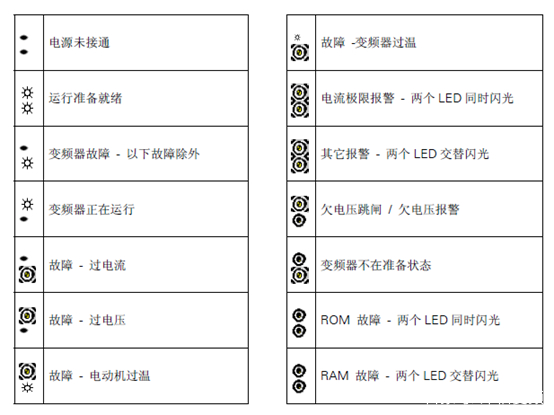 西門子變頻器的上,下兩個ALM指示燈有四種狀態,分別是燈滅,長亮,快速閃爍,和閃爍,分別代下以下含義: