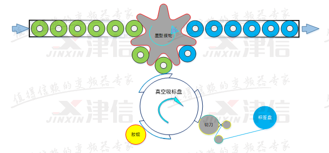 如圖中所示;設備采用了真空旋轉式標盤,具有吸標、傳輸、貼標等多方面功能,同時涂膠輥與切刀輥負責標簽的切斷與涂膠,并設有‘無瓶不出標’和‘無標不涂膠’功能,提高了貼標效率與工作的可靠性。