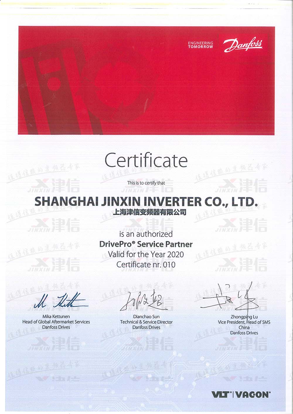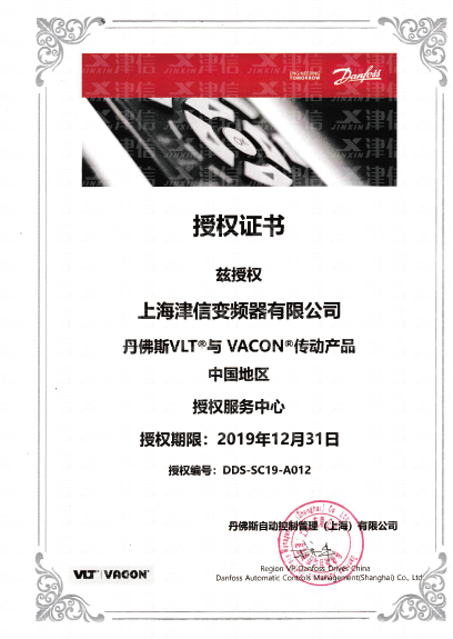 丹佛斯和偉肯變頻器服務中心授權證書